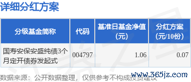 本站消息,6月19日发布《国寿安保安盛纯债3个月定期开放债券型发起式证券投资基金分红公告》。本次分红为2025年度的第1次分红。公告显示,本次分红的收益分配基准日为6月6日锦达网,详细分红方案如下: